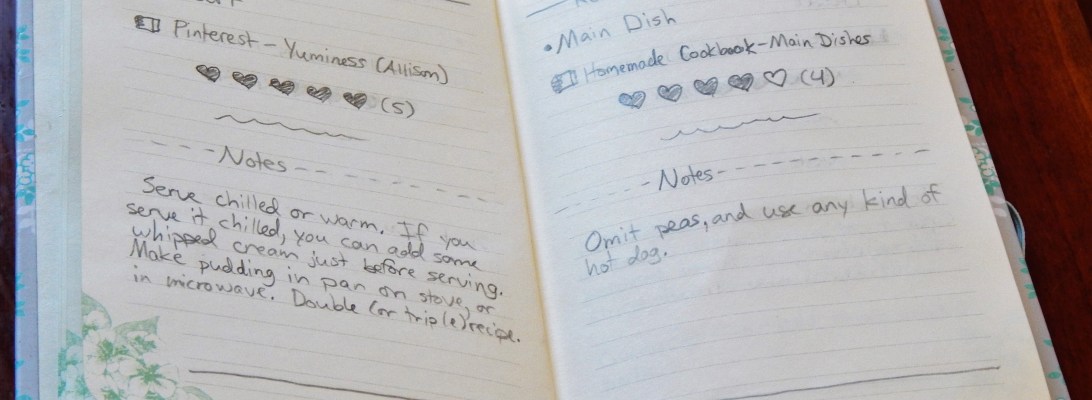 Let’s use the chocolate pudding page for an example. (The pudding is delicious, by the way!) At the top we have the title of the recipe, then we have a dot with the category of the recipe (whether it is a main dish, side, dessert, etc.). The little book symbol shows where to find the actual recipe, whether it’s from your stash of 50 cookbooks, or collected from the internet. The little hearts show you how much your family likes the recipe – a little or a lot! My family rated the chocolate pudding 5 stars, er hearts. I told you it was good! The little wavy line underneath the hearts is where you’re supposed to write the date you first made it, but, uh, I couldn’t remember, so I just wrote a little wavy line. 🙂 Next we come to the notes section. This is where you write down any changes you made to the recipe, the best way to serve it, etc. And we’re finished with the tour! Here’s an example page just in case you didn’t catch everything.